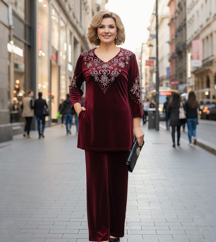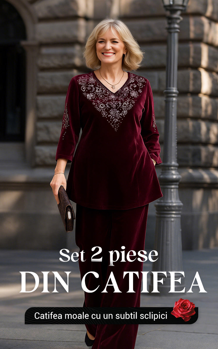 УНИВЕРСАЛЕН СТИЛ ЗА ВСИЧКИ ПОВОДИ – С класическа кръгла яка и детайли от кристали, този комплект е идеален за зрели жени, които търсят вечен стил и комфорт. Той повишава самочувствието ви и изтънчения ви външен вид.