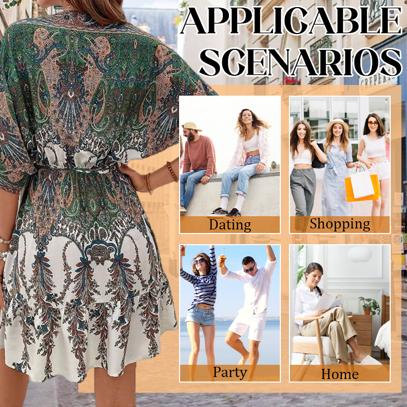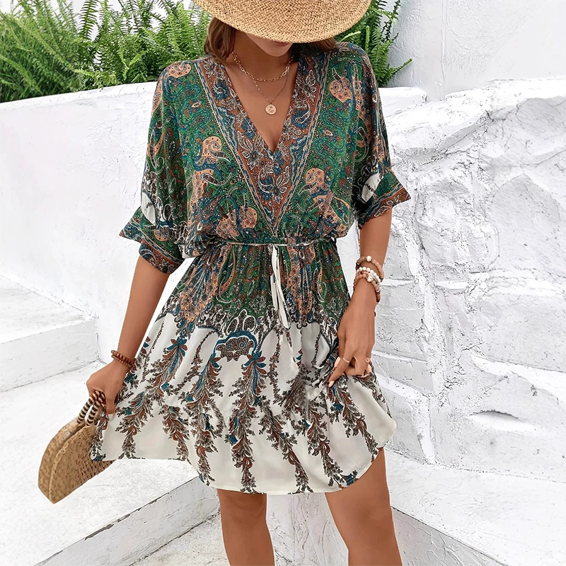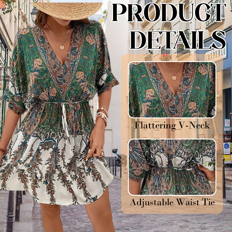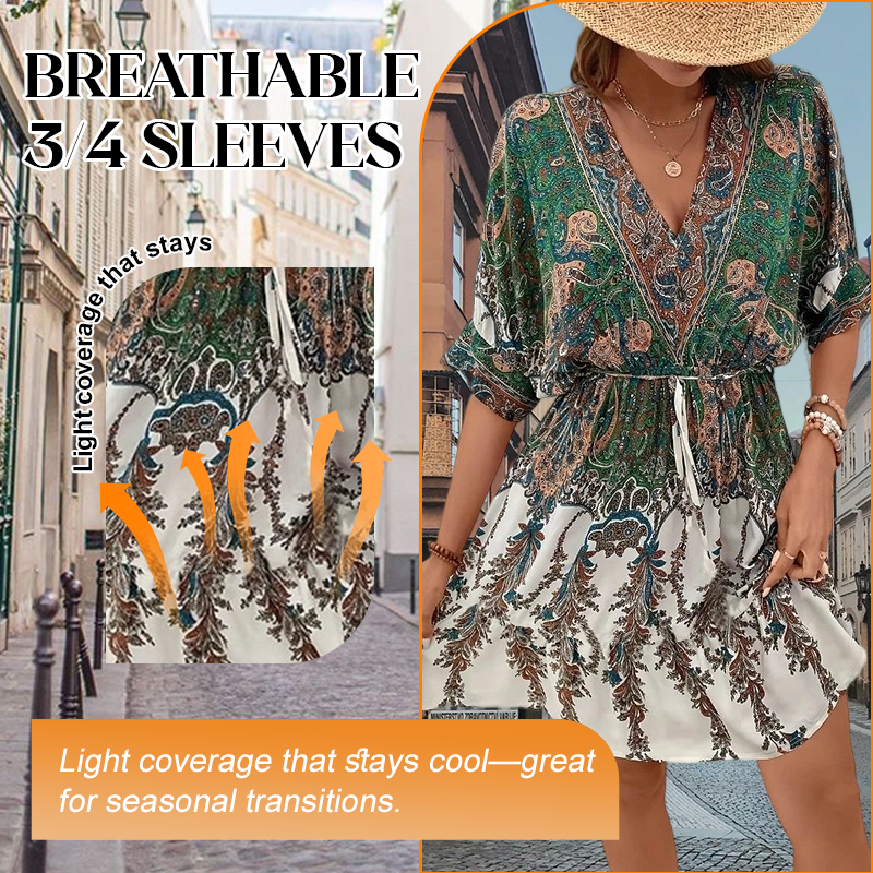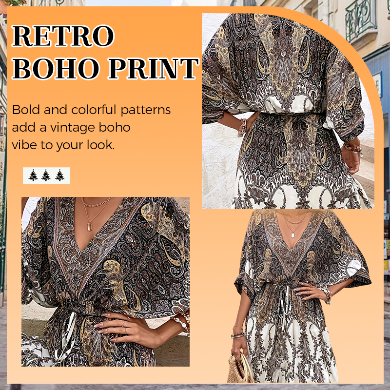 Пакетът включва: 1*Бохо рокля с ретро принт и 3/4 ръкав с деколте