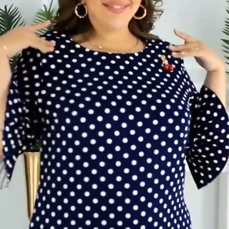 ВДЪХНОВЕНА ОТ ВИНТАЖ ШИРОКОСТ - Класическите точки танцуват по тази рокля, а къдричките в подгъва и маншетите добавят романтично движение. Свободният миди силует оформя всяка фигура с лек чар на 50-те години на миналия век.