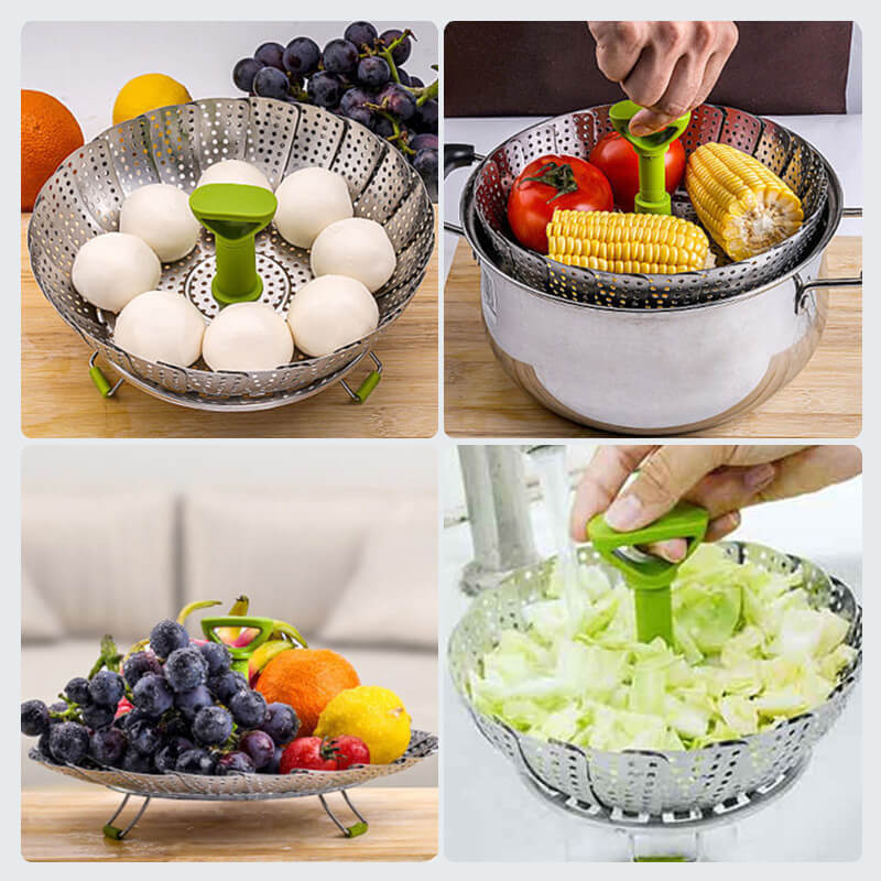 Кошницата за готвене на пара е идеална не само за готвене на пара на зеленчуци като карфиол, моркови, царевица и картофи, но може да се използва и за готвене на пара на раци, морски дарове, месо и дори десерти. Освен това тя може да се използва като кошница за плодове, цедка, поставка за яйца или чиния за плодове. Това е основен инструмент за всяка кухня.