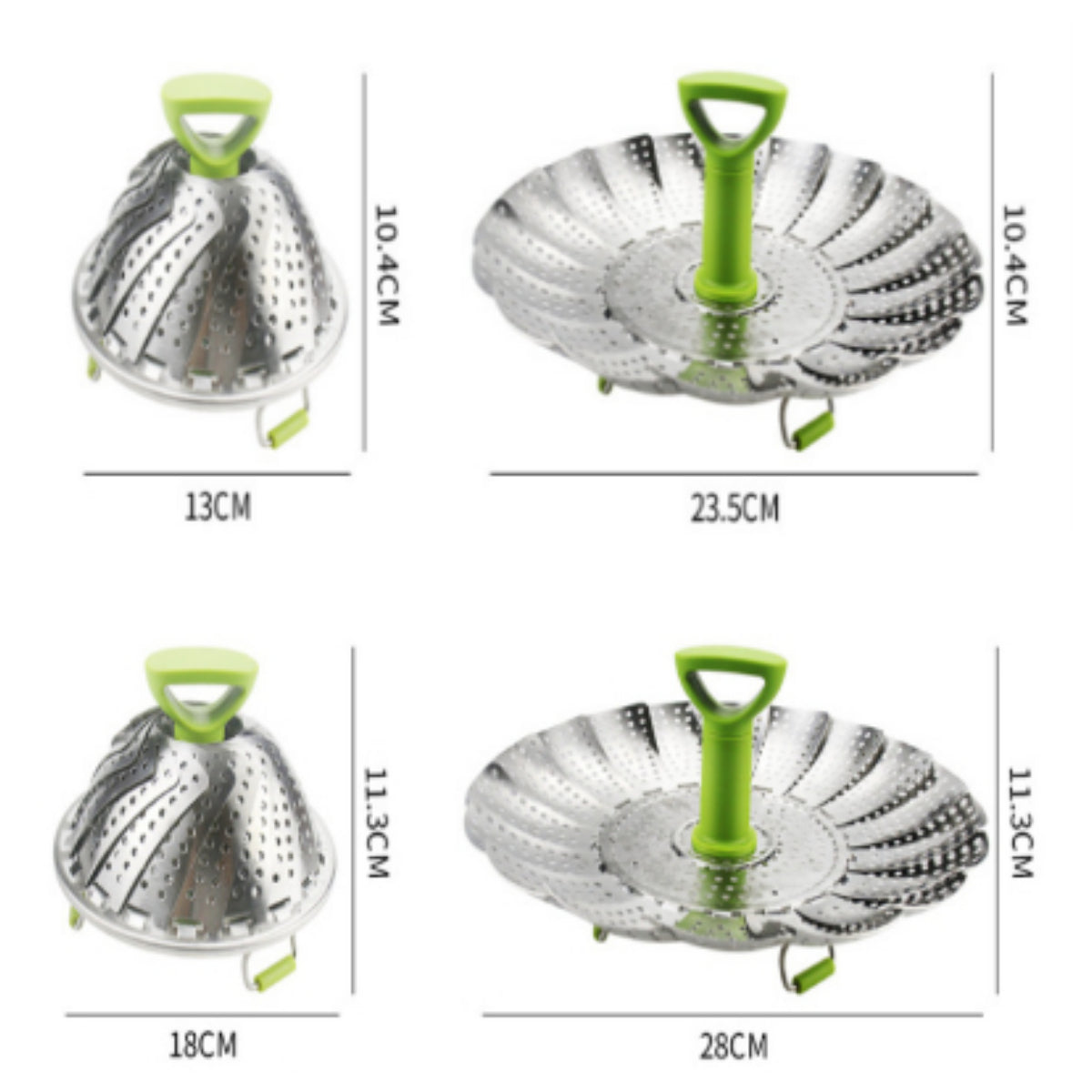 Кошницата за готвене на пара с висококачествени венчелистчета от неръждаема стомана, дръжка от пластмаса за хранителни цели и силиконови крачета ще гарантират вашето здраве. Готвенето на пара е здравословен избор за готвене, тъй като помага да се запазят повече от 90% от хранителните вещества, които се губят при варене или микровълнова печка. Сгъваемата кошница за готвене на пара може да се използва за готвене на пара на зеленчуци, морски дарове, яйца, месо, десерти, бебешки храни и много други.