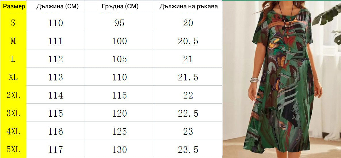 ЗА ВСЯКА КРЪВ - тази рокля се предлага в размери от S до 5XL и приляга на всяко тяло. Свободната, ласкателна кройка елегантно обгръща извивките за комфорт и увереност. Перфектна за всяко лятно приключение - от релаксация край басейна до разходка по залез слънце.