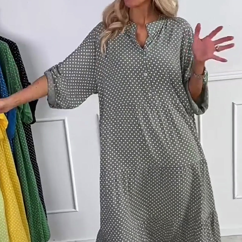 РОКЛЯ, КОЯТО ОТКРАДВА СВЕТЛИНАТА - Тази дамска рокля на точки е с вечен черно-бял принт на точки, който с лекота съчетава ретро чар с модерен стил. Предната част с копчета придава шик, а ласкавото V-образно деколте подчертава елегантността, без да е прекалено откриващо.