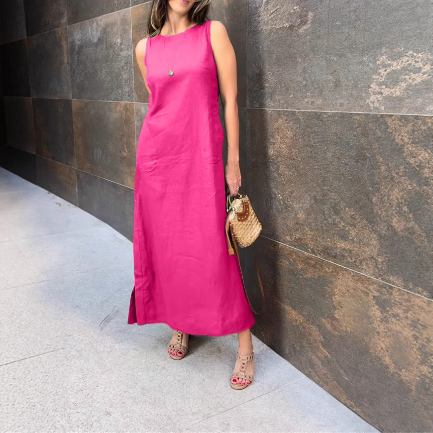 1 * Дамски плътен цвят бутон страна разделение без ръкави рокля