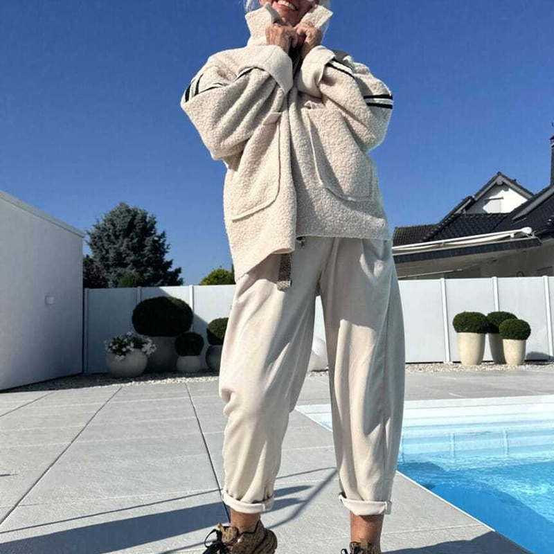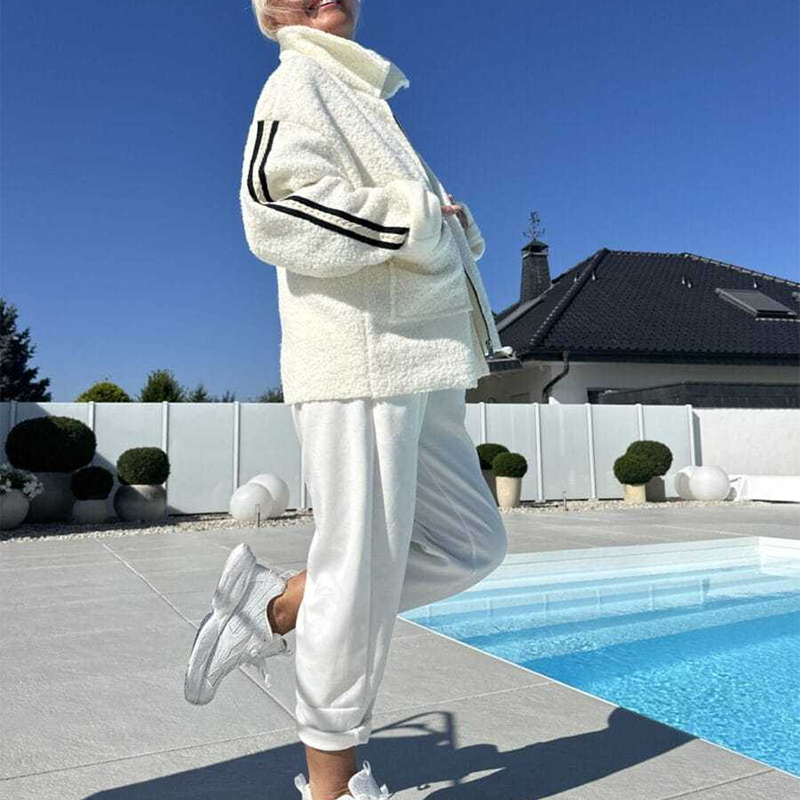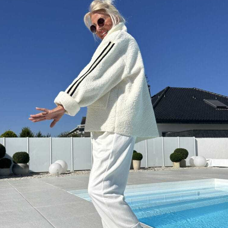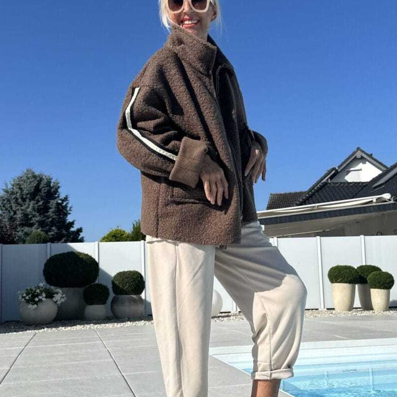 СЪВРЕМЕНЕН ДИЗАЙН С СПОРТНИ АКЦЕНТИ - Изисканата яка и елегантната силуетна линия са подчертани от отличителните раирани детайли по ръкавите, които придават модерен спортен акцент. Това перфектно съчетание на класическа елегантност и спортни елементи създава универсална дреха, която лесно преминава от ежедневно облекло за деня към вечерна елегантност.