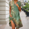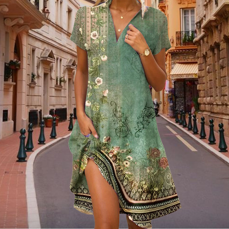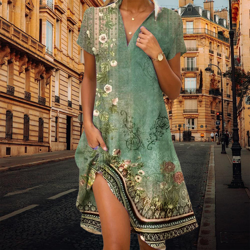 ХАРАКТЕРНИ БОХЕМСКИ ЩАМПИ: Тази рокля съчетава етнически и селски елементи в сложни, ярки щампи. Дизайнът на свежата зелена флорална версия се отличава с характер и стил.